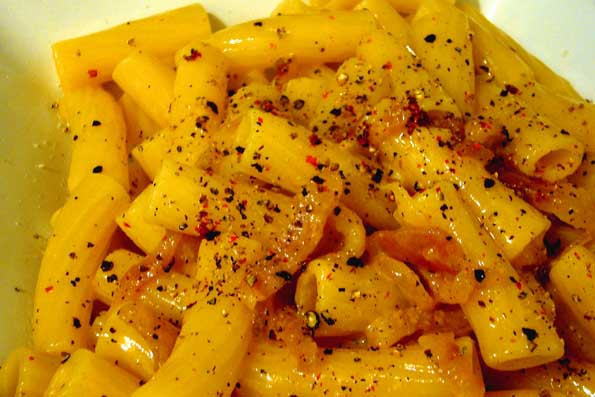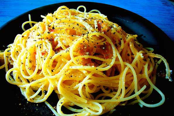 | 5=これが出来上がり。スパゲッティ編。 ローマではショートパスタで 食べる。 と言っても、レストランのメニューにはスパゲッティしか載ってないかも。 「無知な旅行者に合わせているのさ」とウエイターが言っていた。 |