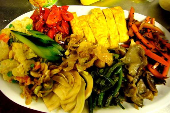 | 7=某レストランの厨房にて作った時の前菜盛り合せ。 10種類を 少しづつ食べ比べするべく考えた。 この日は焼肉のタレ(自作)に漬けたラム肉のスカロッピーナとナスの挟み揚げがメイン。 |