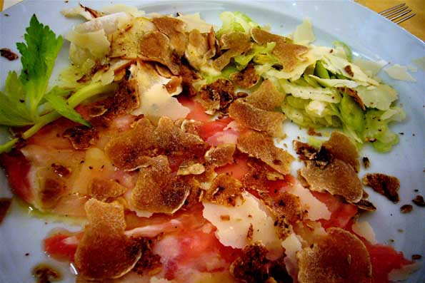 | 17=トリュフの季節到来。 当然試食です。 でもねー、トリュフとチー ズを一緒にしないで欲しい。 溶けたチーズと組ませたメインディッシュも出た。 アメリカ人は「オー、デリシャス!」と感嘆していたが、そんなことでは味音痴ですよ。 トリュフは香りが命! 極端な話、女性も香水無しで食卓に就くくらいで ないと、心がけが今イチ。 味わうというのは、そう言う真剣な世界だもの。 |