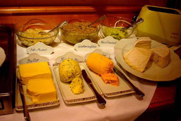 | 23=郊外の民宿の朝食。 朝からバターの一軍と一戦まみえる。 こりゃ 太るぜ。 ほうじ茶と湯沸かし器セットを持ち歩いているのは正解。 |