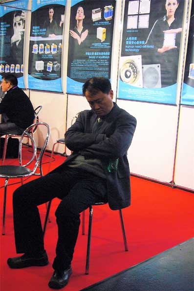 | 25=見本市視察の仕事中のスナップ。 ブースで爆睡する中国人。 お疲れなんだよね、判ります。 過労死しないようにね、アジアの人たち。 |