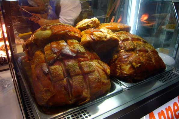 | 27=この国でも豚は「聖なる豚様」であった。 これを分厚く切ってもらって、バイツェンビールとポテトで昼食。 |