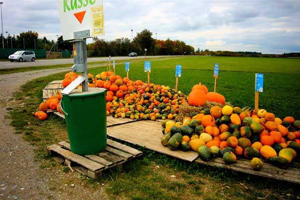 | 32=見本市会場近くは宿が満室なので60km離れた温泉地に滞在。 村道ではカボチャの自動(?)販売システムが!。 勝手に選んで、自己申告でおカネを払って、持って行く。 でも、いくつ でも持ち逃げ可能だ。 これは、イタリアでは無理だなー。 あなた、こんなのがナポリにあったら、この駐車スペースに路上バーベキュー屋台が3台は並んで大繁盛ですよ!。 え?第一、カボチャのおカネ払わないで持ち逃げだって? そんなことは ないでしょう。 カボチャよりは、その料金箱をセメント埋め込みのバケツごと持って行くだろうけれど。 |