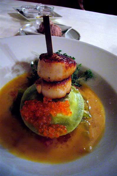 | 34=最後の夜、イタ飯屋的名前の店に行く。 これは前菜。 ホタテにイクラ。 良いんだけれど、クリームソースが余分。 素材で勝負しているのだから、オレとのガチの勝負を邪魔しないで、っ て感じ。 |