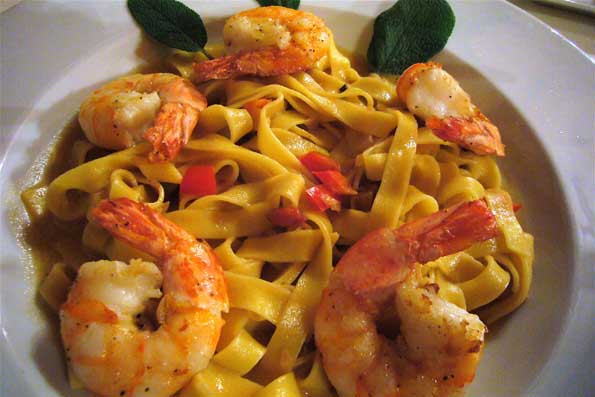 | 35=エビは冷凍。 パスタは手打っぽかった。 一口目はウマいんだけれど、ここでもクリームソースが甘ったるい。 食べ進むにつれて飽きて来 る。 |