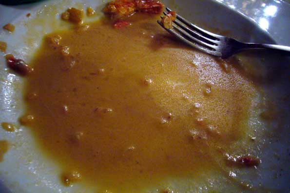 | 36=食べ終わったところ。 これだけのソースが下にある。 クリームを 入れればウマくなるけれど、味をごまかしていることにもなる。 考えてみたら、結局、油系にバターを使う地方は、クリームにいとも簡 単にシフトして行くのだろう、と判った。 食後、バターの甘ったるいソースのゲップが上がって来るのは結構こた える。 |
