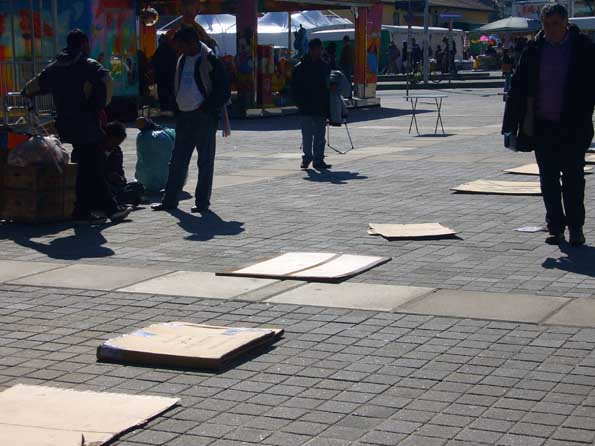| 16=これから始まる縁日の場所取り。 段ボールが陳列台の下部になる わけです。 |