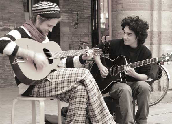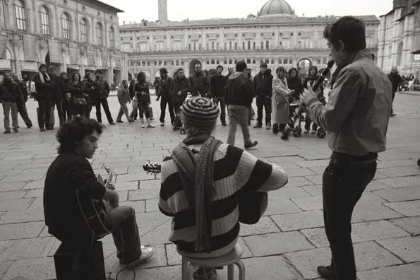 | 22=ボローニャ空港から,そのまま街の広場に行き久々に息子たちの演奏を聴く。 20歳前で、自分もあのくらい弾けてたらなー、と羨ましくなる。 |