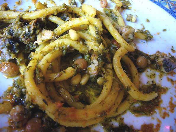 | 4=グチャグチャである幸せ。 松の実、ブドウ、アンチョビー、タコ。 パスタは当然太めのブカティーニでないと負けてしまいます。 |