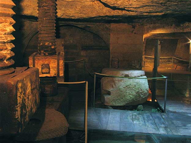 | 1=南イタリア某村の広場地下にある、共同のオリーブ絞り場遺跡。 岩 盤をくり抜いて作った凄いもの。 オリーブオイルは、食用としてはもち ろん、灯油として貴重だったので、ここには泊まり込みで警備する人が居た |