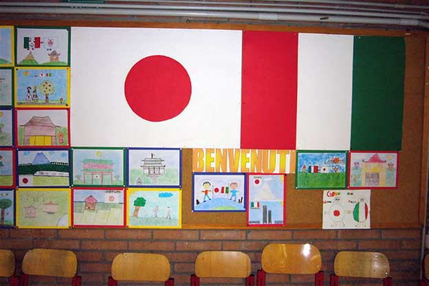 | 9=文化交流の通訳で小学校視察。 イタリア人から見た日本のイメージ が間違いだらけで楽しい 。しかし、先生!一番の間違いはイタリア国旗 の色の配列じゃないでしょうか! 赤が右だろー! まあ、この辺がラテン の国の良いところ、気にしては(生きては)いけないよ。 |
