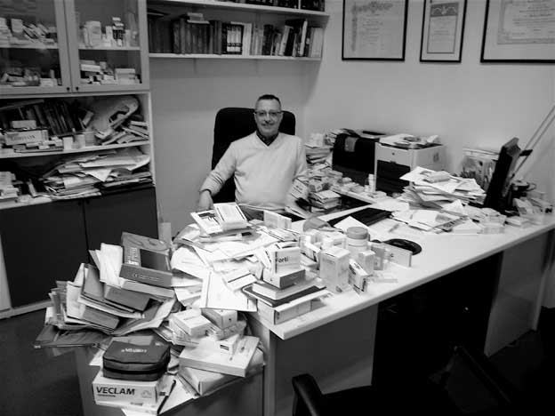 | 18=・・・というので、ドクターのところへ血液検査に行く。 机が薬 に埋まっていて笑えた。 信頼できる医者とはこういうタイプだろう。 |