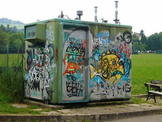 | 22=ボローニャの公園へ数年ぶりで。 この建物は何?大気汚染観測 ボックスです。 まあ、民衆に愛されているのが良く判る。 |