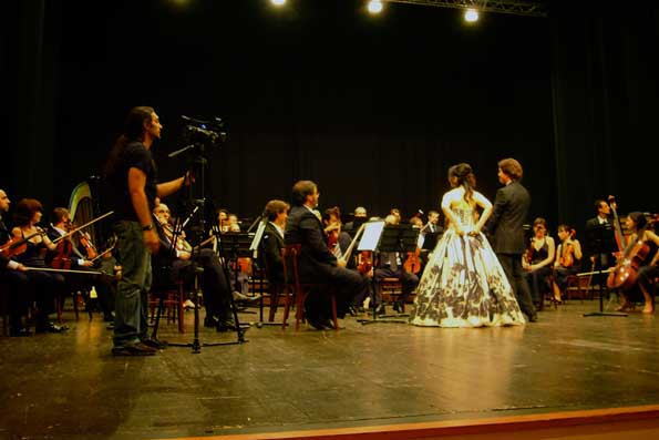 | 本番のスナップ。 イタリア・ハシモトチームの映画監督ロベルトがス テージを撮っているところ。 撮影は歌い手、指揮者、オーケストラ、撮影スタッフのみんなが素晴ら しい性格で万事うまく行った。 11月頃にCDが出る予定。 |