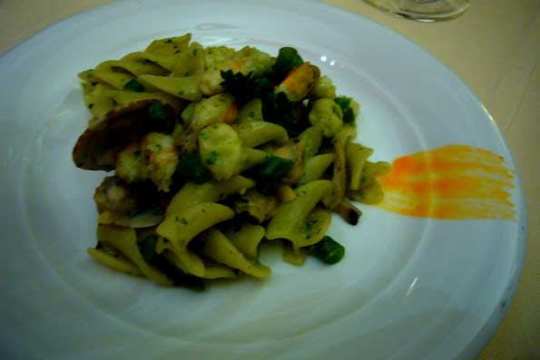| エビ、ブロッコリ、松の実のパスタ。 |