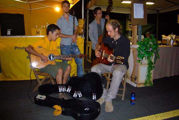 | 有名な音楽家をフォローしたあとは、無名の音楽家、光のバンドを遠くの村のビールメーカーのステージに送って行く。 これはステージ後に路上で始まったおまけのライブ。 生ビールに生バン ド、最高です。 |