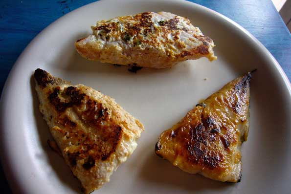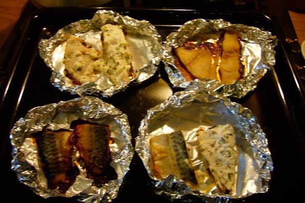 | サバとイシモチを2種類の味付けで仕込む試験。 左はあんずジャム漬け、右はギリシャのヤギチーズ漬け。 2種類の魚、2種類の味付けをそれぞれ1日後、2日 後、3日後と試食したので、12回食べたことになる。 |