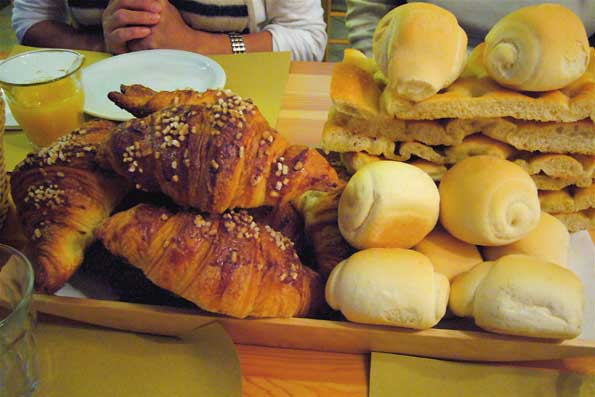 | 民宿に泊まり、翌朝のテーブルではパンが台風時の土嚢のように山盛