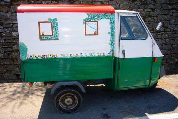 | 昼は世界的避暑地のポルトフィーノにて食べるわけが、クルマが多すぎてたどり着けずに撤退。 飛び込みで地方料理店に行くことになった。 これは歩いて店に向かう途 中、村にあった三輪車。 手描きの装飾が何とも言えない。 |
