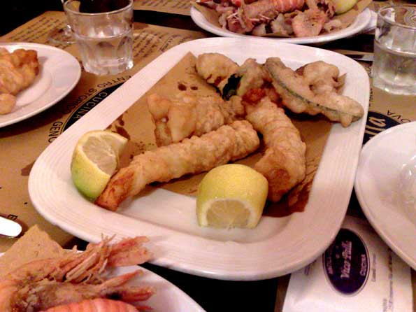 | 300年以上の歴史を持つ船乗り居酒屋「VICO PALLA」に行く。 こ こはジェノバのバジルペーストの聖地。 とろけるようなウマさで有名。 しかし、聡明な添乗同行員の私は、入って即、海の幸フライを頼んだのでした。 パスタのあとにフライというのが普通だけれど、多分品切れになるだろ うから、 「前菜としてすぐにフライだ!」と第六感が働いたおかげで、 15分後には品切れになった海鮮フライにてビールをグイグイ。 添乗員の鑑ですな。 |