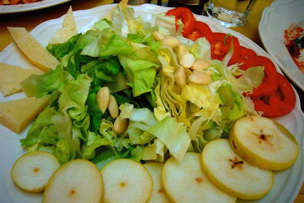 | 昼は下町にてチーズ、アーモンド、ナシ、トマトサラダ。 |