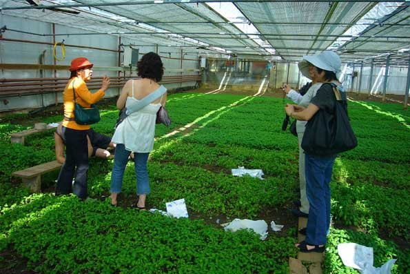 | プラ村のバジル栽培農家視察。 これを全部手摘みで出荷するのだから、 大変な苦労。 温室の中は50度近い。 これでバジルペースト勉強旅 行を締めくくる。 |
