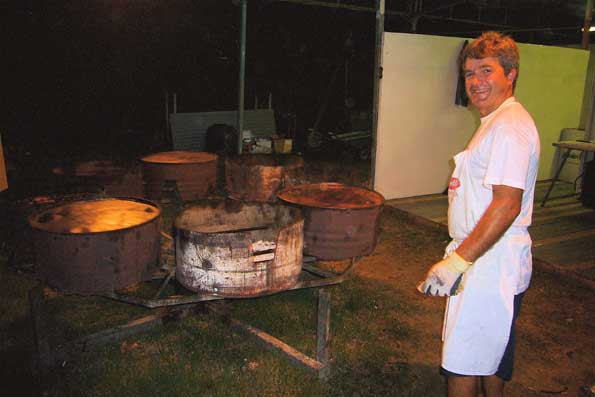 | バーベキュー職人、その2。 隣村の共産党祭りにて。 ドラム缶を ぶった切ったモノが6ヶ回転するようになっている。 一気に大量に焼けるので便利。 |