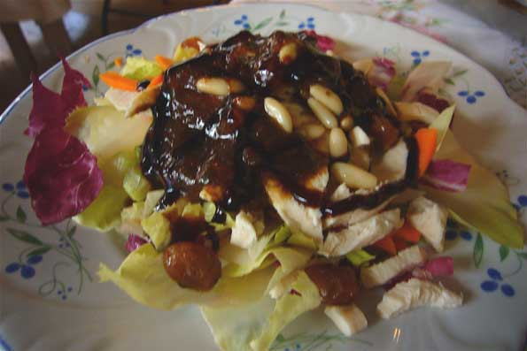 | 12=「単なる野菜盛り合せだろー、これは?」 そう言われるアナタ、 次回はぜひご一緒に! 松の実、干しぶどう、バルサミコ酢和えの河スズキサラダです。 百聞は 一食にしかず、ですぞ。 |