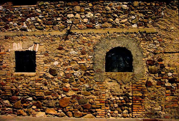 | 34=岬突端の遺跡まで歩く。 騙し絵のある壁にホンモノの花の対比が 面白い。 陽射しはあくまでも強烈。 妥協しないところが救われる。 |