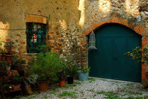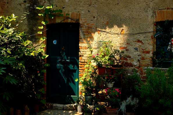 | 26=小さなガレージ。 釣りの道具、鉢植えのハーブ。 「ああ,お婆 ちゃんのパスタが食べたい!」とミラノで暮らす次男が思い浮かべるのはこういう庭の一角。 |