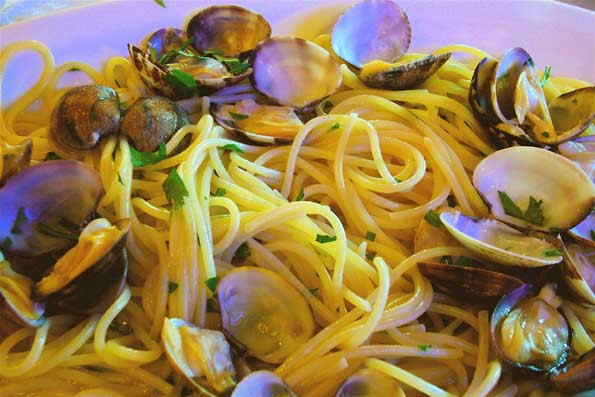 | 36=ボローニャに戻りお客さんと最後の夕食。 ピザのウマい店を、と いう事でお薦めのMに行く。 ボンゴレを食べるのは僕。 日本では3人前はあろうかというのを、食べてしまえる自分が怖い。 |