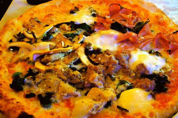 | 37=オーナーに頼んで「特別ゴチャ盛り」ピザを焼いてもらう。 電気竃のくせに、ここのピザは抜群にうまい。 その代わり、薪の竃でないから「真正ナポリピザの店」には加盟できな いのだ。 しかし、生地はナポリ風だし、焼き方は最高だし、文句は言えないぜ。 ただ一つの欠点は・・・値段が安いという事かな? 一緒に来る? |