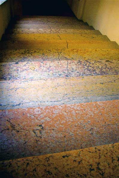 | 3=階段の石の色が全部違う。 ミラノのドゥオーモでも同じ風景を撮っ た記憶が蘇る。 石的にはヴェローナの赤と呼ばれる美しい石がこのあたりに普及している。 トスカーナやリグーリアでは大理石の白さが印象に残ったが、各地方そ れぞれの地元素材を使っているのは料理やワインと同じ。 「こういう面 を見るのが、実に大事で、パック旅行では無理なんですよと、 まあ、こ ちらから言いたい事をお客さんが気づいてくれるのはうれしい。 「発見のない旅は、ニンゲンの輸送でしかない」のですよ。 |