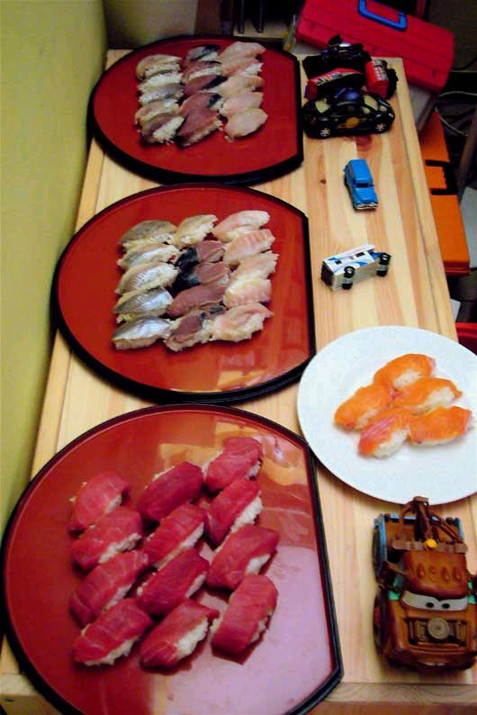 | 10=甥っ子の誕生日に出前寿司の贈り物。 主役は味噌ラーメンなので、 寿司は前菜扱い。 甥の息子は3才だが、2才くらいから和食に親しんで いる、将来が楽しみだ。 |