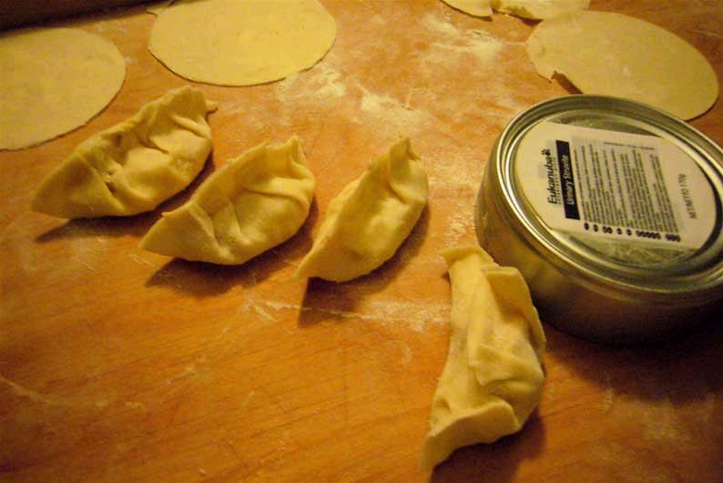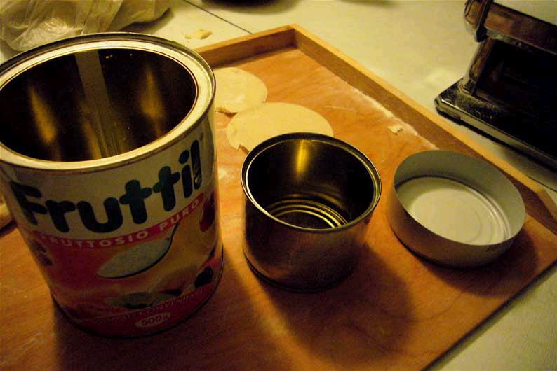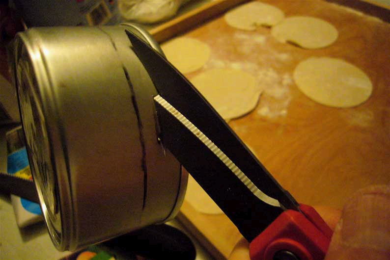 | 12=果糖の缶、高級ネコ缶、ダイエットネコ缶と3個並べてみると、 一 番右のものがギョウザに向いているかなと判断できた。 これを切って行く方法を考えながら生地をこねる。 |