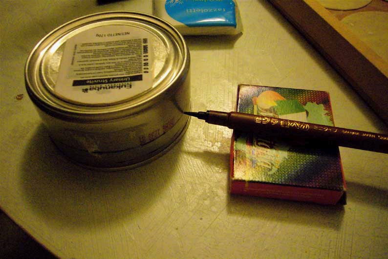 | 13=まずは切口の高さを一定にすべく、ペンを固定して缶を回しながら 印を付ける。 |
