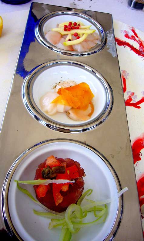 | 19=前菜の小鉢。 上から、タラに青リンゴ、ザクロ。 ホタテにからすみ。 マグロにトマト。 |
