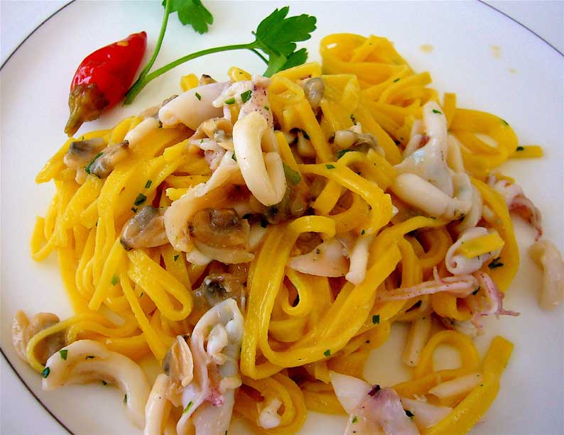 | 20=海の幸パスタ。 唐辛子は揚げてあり、しっぽを切って辛い液を出して、パスタと混ぜる。 イカが柔らかくてウマし。 |