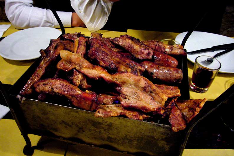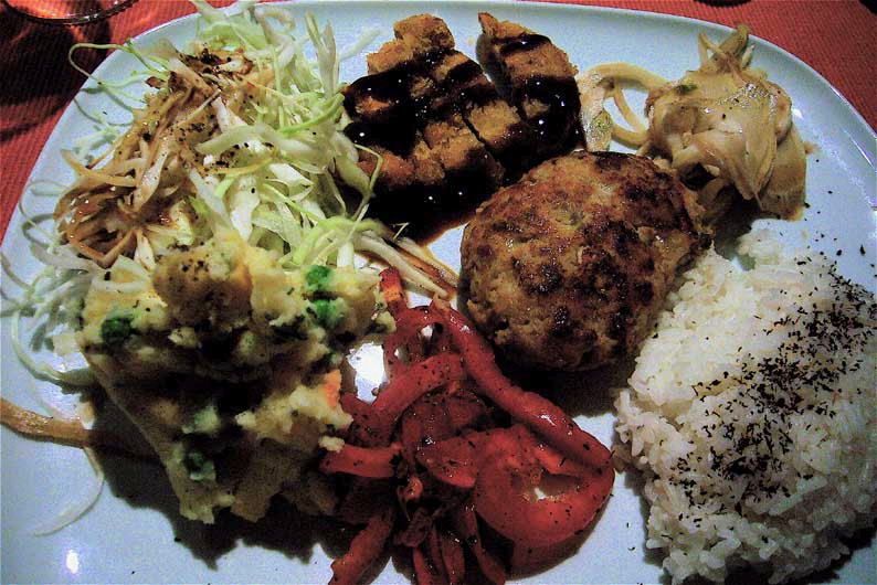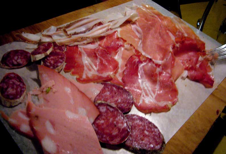 | 28=その晩は、これまた、いつもの農民料理。 聖なる豚様盛り合わせだ。 豚が豚を喰っているので「共喰い晩餐会」だ。 |