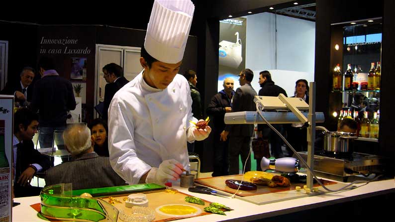 | 30=Aさんのデモンストレーション風景。 日本職人の技にイタリア人はいつも度肝を抜かれる。 |