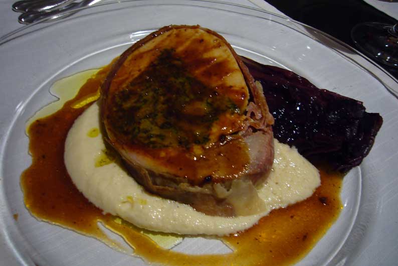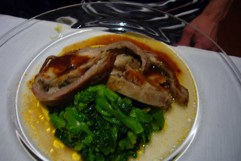 | 34=以下2点、羊とウサギ。 味が強過ぎずバランスが良い。 ワインも3種類を順番に。 4人で食べまくって行ったが、その夜4人メ ンバーのうち、2人が下痢と嘔吐で大変な事に。 同じものを食べて平気だったのが、私:半分イタリア人と、A氏 の奥さん! この2人の胃袋はどういうことになっているのでしょう? |