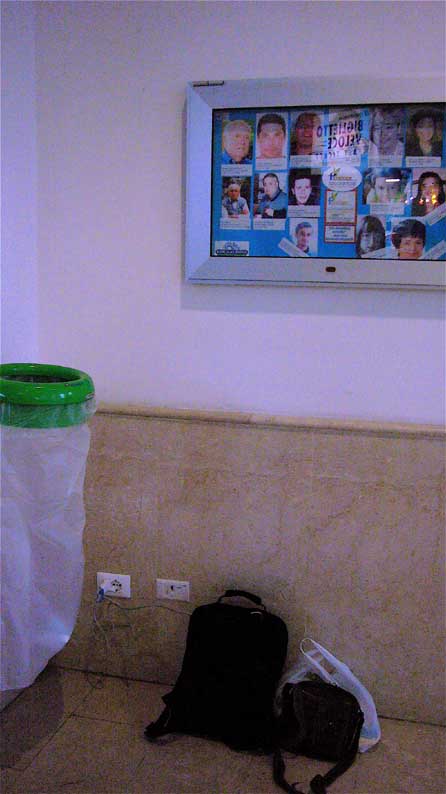 | 39=電車でリミニへ。 PCの電源が心細くなったので駅の構内で充 電(盗電?)させてもらう。 そこのゴミ箱の上にPCを乗せれば理想的な環境だぜ,と思ったが壁にかかっている掲示板を見てビックリ! |