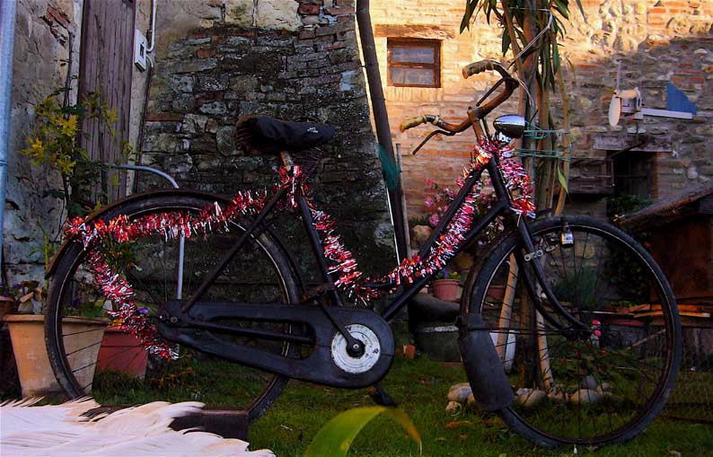 | 4=その夕べの前に、地元の丘を案内して昼の腹ごなし。 中世からの古城 をカメラ散歩。 クリスマス間近でなぜか庭に自転車のお飾りが。 |