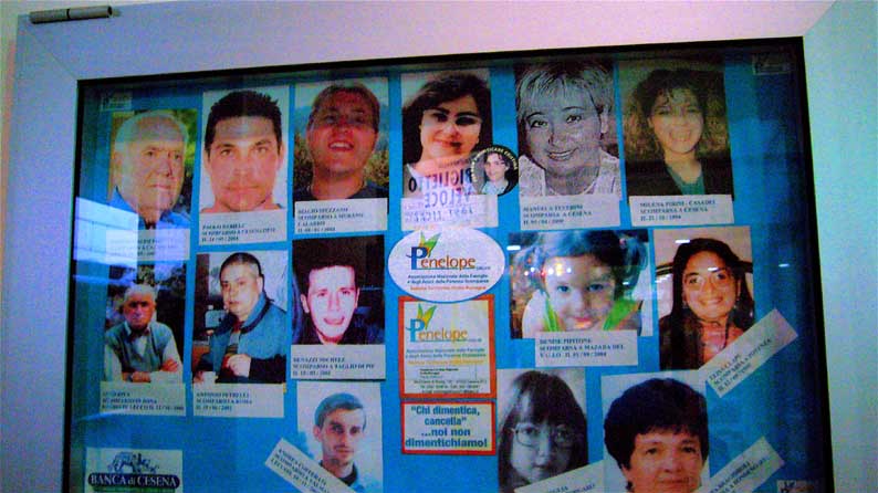 | 40=これがその拡大。 ここ20年ほどの間で失踪した人の顔写真ば かり並んでいる。 写真では幼女だったり、女子高生だったりするが、現実問題としてもうそれから10年以上経っているのだから、こうい う写真自体、意味が無い。 いわば「過去の亡霊」。 でも残された側の人間は、あの時点で時が止まっている。 忘れられない、認めたくない大きな傷。 |