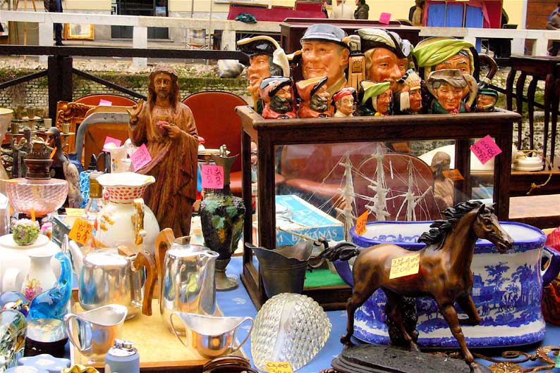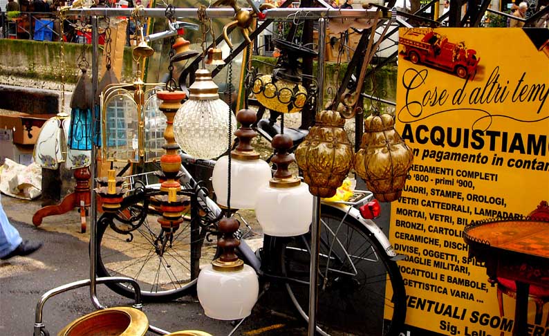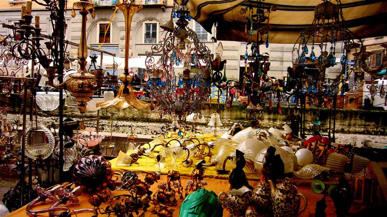 | 50=ナビリオ地区のアンティーク市を見に。 なんでもあるが、ビックリ したのは、カバン類の多さ。 さすがファッションの街だ。 |