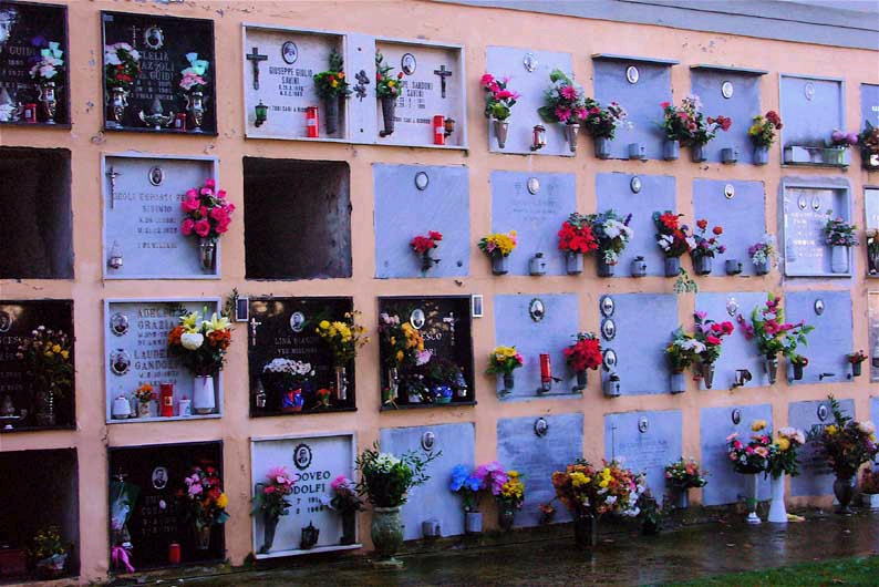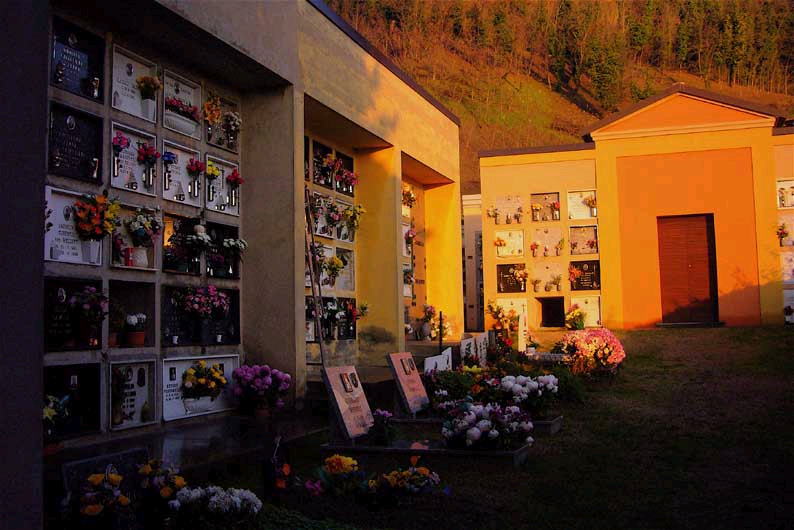 | 7=古城の入口にある公共墓地。 ボローニャ郊外の丘にある「静かなご休憩処」という感じだから、 地元に引っ越して来たばかりの頃は、自分が ここに埋葬されるのも悪くないな、と思っていた。 |