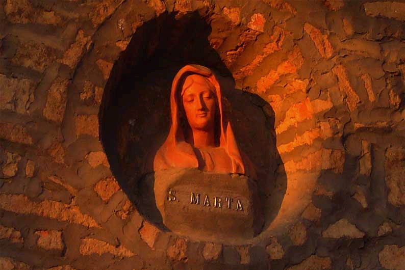 | 9=12世紀の村の教会。 マリアに射す夕陽。 そんなに見つめられると 「え、ぼ、ぼく?何も悪い事してませんよ」とドキドキしてくる。 |