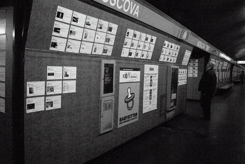 | 地下鉄駅に張られたメッセージ版。 家からクルマから、ペットから、古着まで。 何でも売ります。 「私の人生、売ります」「そんなセコハンの夢なんか、いらねえよ」 |
