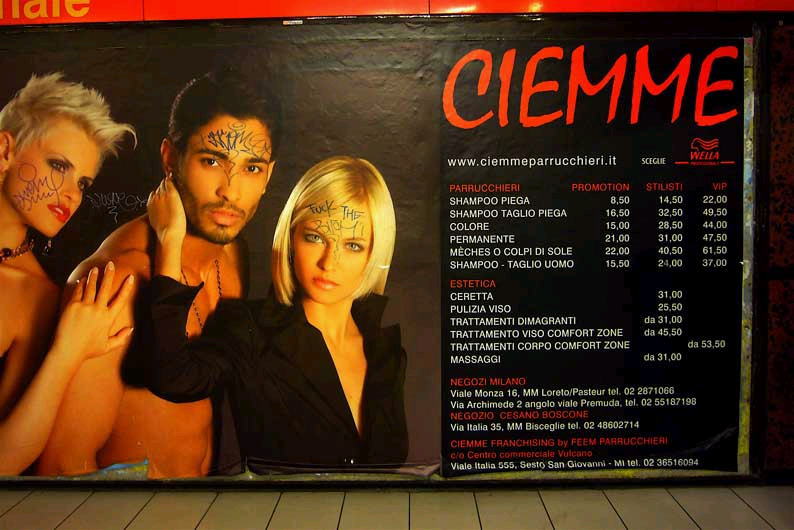 | 駅にある、美容室の広告。 モデルの額には即「娼婦に一発を!」とか書かれてしまう。 が、この写真を撮ったのは、美容室の値段が松、竹、梅と3通りあるのが面白かったから。 例えば洗髪とヘアセットは梅が8.5 竹が14 松が22ユーロだ。 どういう違いがあるのか、興味がわく。 行ってみようかしら。 |