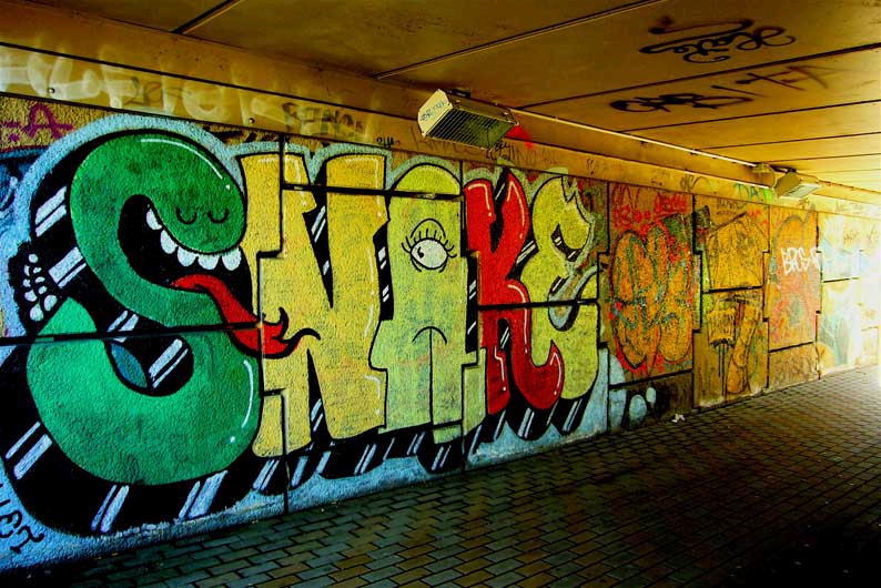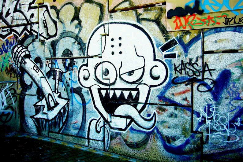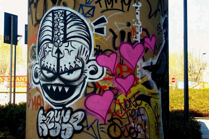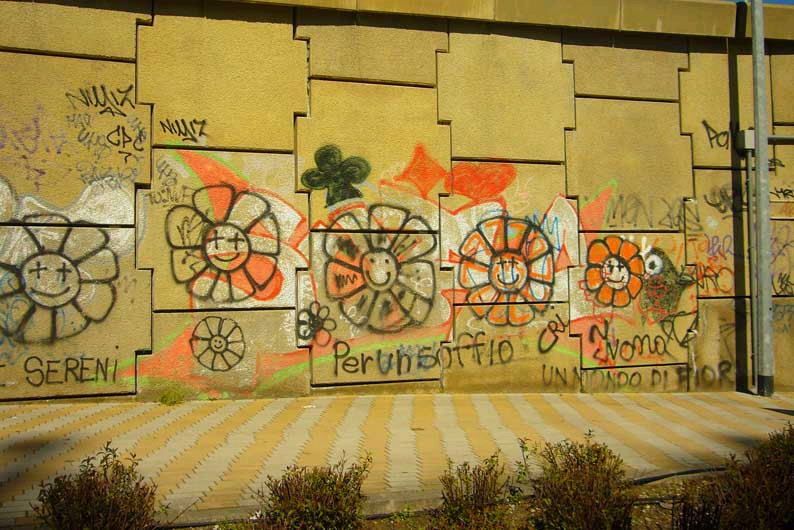 | ナビリオ運河近くの大作。 上のと比べて、色の使い方に幅があるので、見ていて飽きない。 青系統と黄色系統の対比をもとに賑やかさを出している。 これも落書きだが、他の下らない落書きに汚されないような、大きな壁を用意するから描いてもらいたい。 |